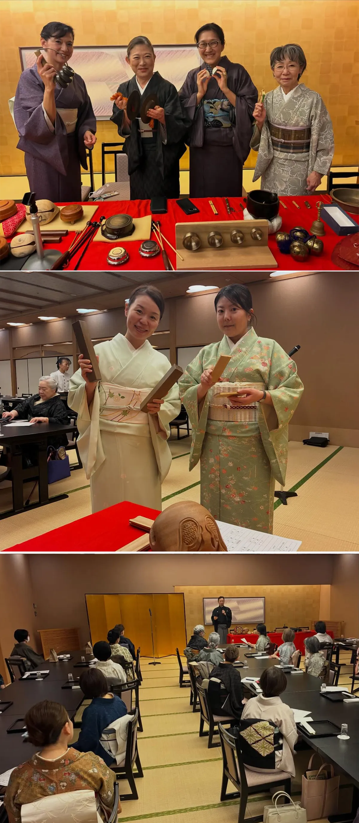 中でも家庭画報に掲載された福原家に代々伝わる小鼓には皆さん興味津々。祭囃子のテンツクテンツク…と鳴らす当り鉦や祇園祭のコンコンチキチキ…と鳴らす「コンチキ」、貝殻の背を二枚擦りあわせるカエルの声では納得の表情でした。